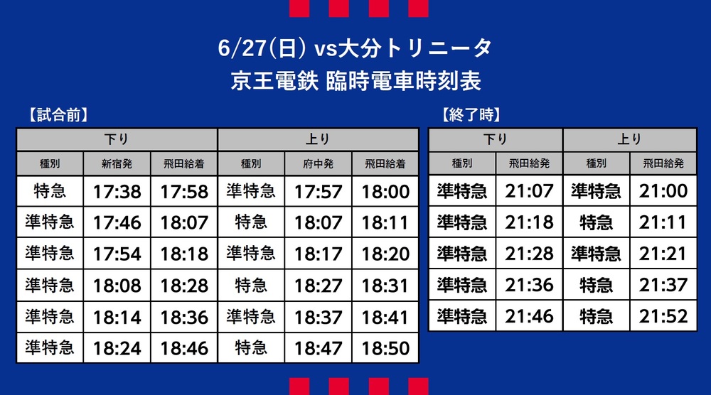 27 de junho (Dom) 2021 Meiji Yasuda Life Insurance Company J1 League Rodada 20 vs Oita Trinita (Início às 19:00 / Ajinomoto Stadium) Informações sobre o transporte temporário (ferroviário) que será operado.