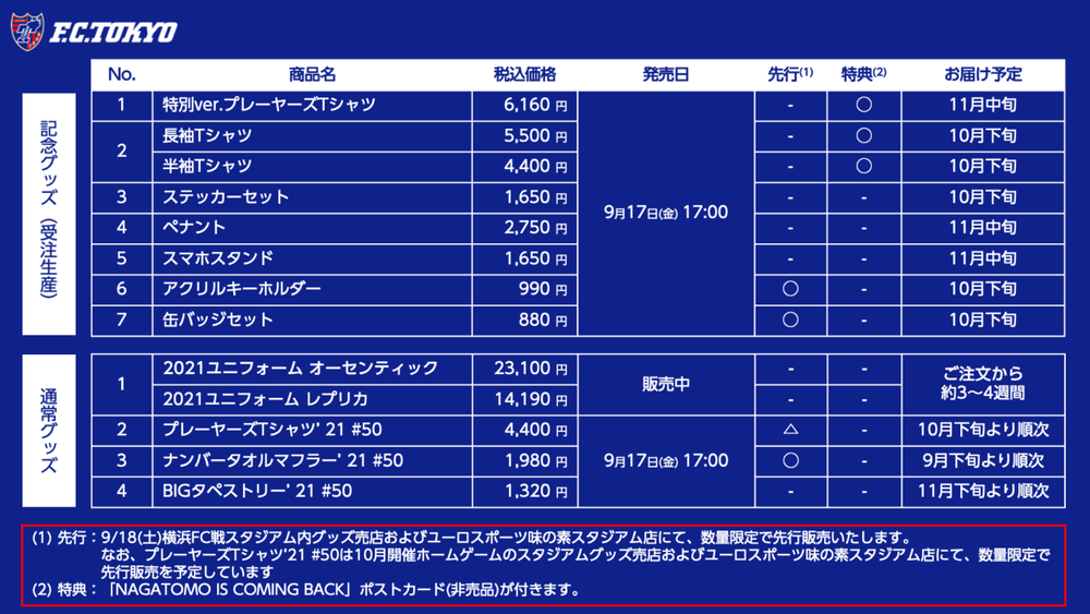 ※ No dia 18 de setembro (Sáb), na loja de produtos dentro do estádio na partida contra o Yokohama FC e na Euro Sports Ajinomoto Stadium, haverá venda antecipada em quantidade limitada.
