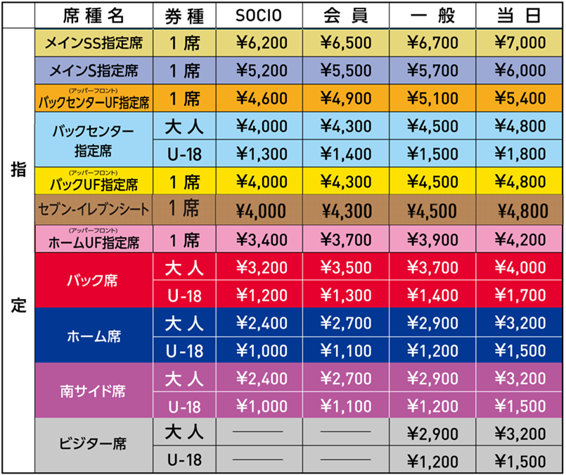 ※Os tipos de assentos onde é permitido usar uniformes e produtos do time visitante, bem como torcer pelo time visitante, são os três tipos mencionados acima: "Main SS Reserved Seat Lado Sul", "Main S Reserved Seat Lado Sul" e "Assentos para Visitantes". Todos os outros tipos de assentos são para torcedores do FC Tokyo.