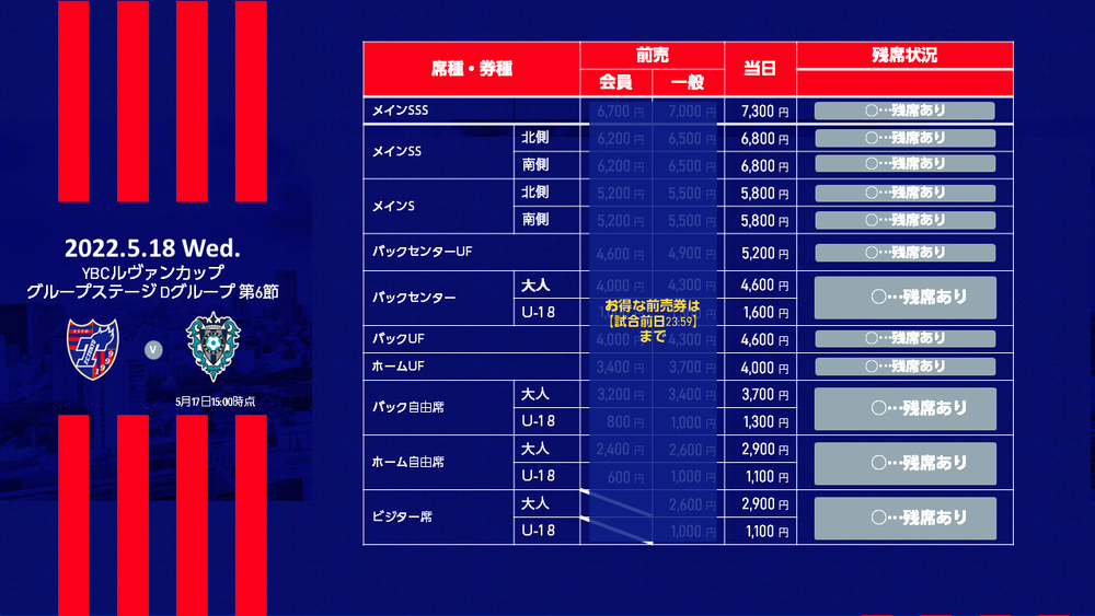 Venda de ingressos no dia para a 6ª rodada da fase de grupos da Copa YBC Levain da J.League 2022: FC Tokyo vs Avispa Fukuoka (início às 19:00 / Ajinomoto Stadium), conforme informado abaixo.