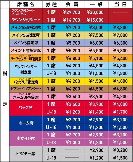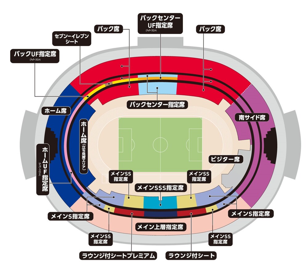 ※Os tipos de assentos onde é permitido usar uniformes e produtos do time visitante, bem como torcer pelo time visitante, são os três mencionados acima: "Assento Designado Main SS Lado Sul", "Assento Designado Main S Lado Sul" e "Assento Visitante". Todos os outros tipos de assentos são para torcedores do FC Tokyo.