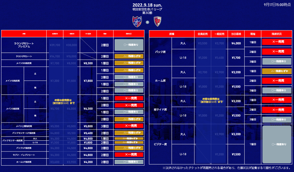 Informamos sobre a venda de ingressos no dia para a 30ª rodada da Liga J1 2022 da Meiji Yasuda Life Insurance Company, FC Tokyo vs Kyoto Sanga F.C. (início às 19:00 / Japan National Stadium), conforme abaixo.