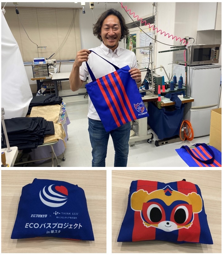 Como parte das atividades do 'Projeto ECO Pass no Ajinomoto', contamos com a colaboração dos fãs e torcedores no Ajinomoto Stadium para a coleta seletiva de garrafas PET. As garrafas PET coletadas podem ser recicladas e transformadas em muitos objetos usados no dia a dia, e esta bolsa também foi produzida utilizando materiais reciclados.