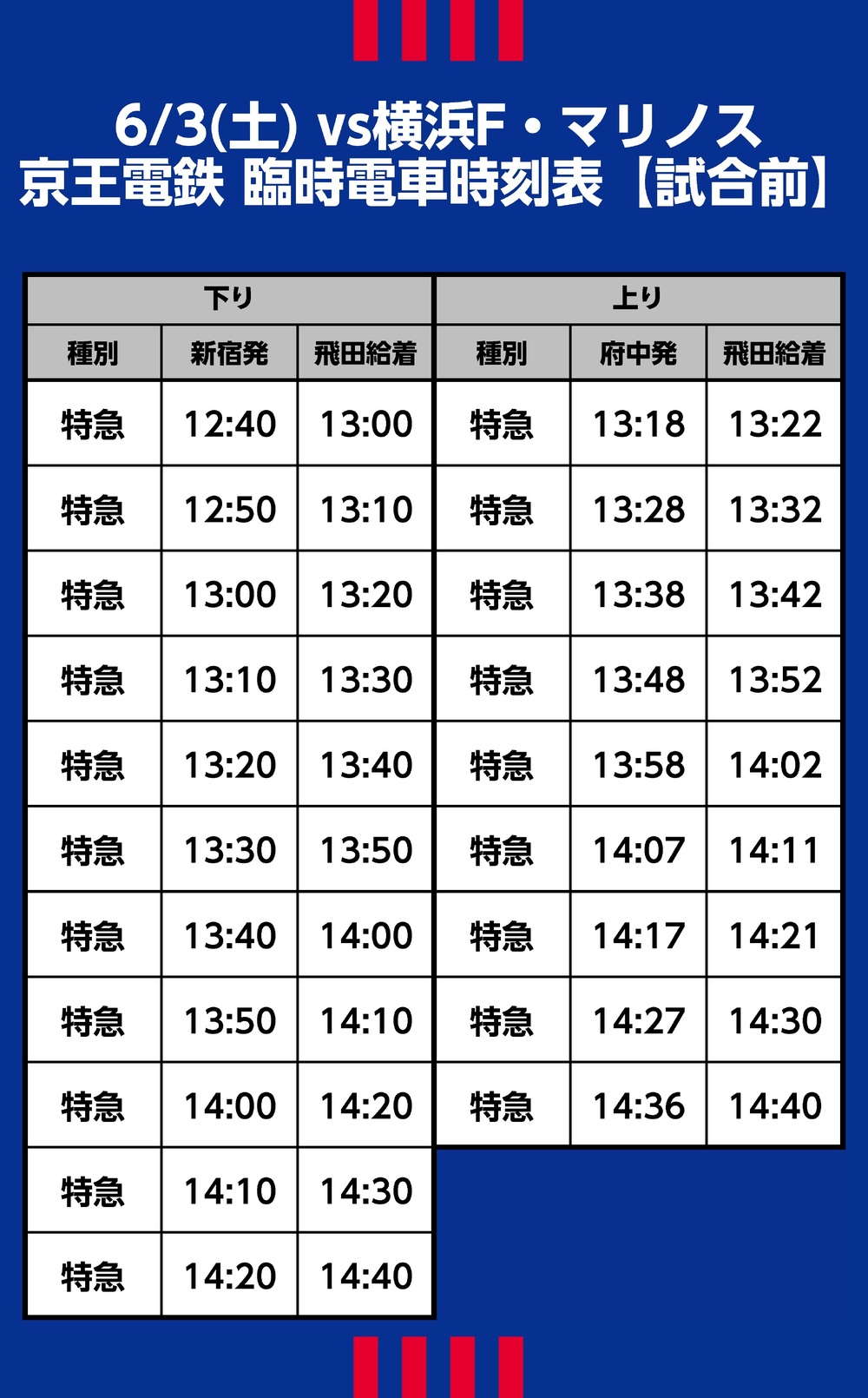 3 de junho (Sáb) 2023 Meiji Yasuda Life Insurance Company J1 League Rodada 16 vs Yokohama F.Marinos (kickoff às 15:00 / Ajinomoto Stadium) informações sobre o transporte temporário (trem), ônibus shuttle e ônibus de linha serão fornecidas.