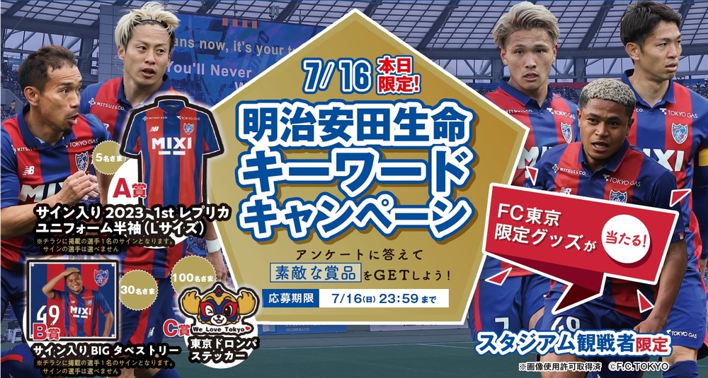 16 de julho (Dom) 2023 Meiji Yasuda Life Insurance Company J1 League 21ª rodada vs Kashima Antlers (início às 19:00 / Ajinomoto Stadium), com o patrocínio do clube "Meiji Yasuda Life Insurance Company", realizaremos o "Meiji Yasuda Life Insurance Company Day". Convidamos todos a se reunirem e virem ao Ajinomoto Stadium!