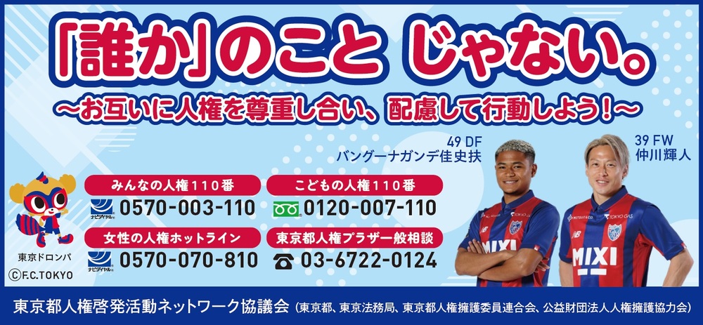 16 de julho de 2023 (Dom) 2023 Meiji Yasuda Life Insurance Company J1 League Rodada 21 vs Kashima Antlers (Início às 19:00 / Ajinomoto Stadium), em colaboração com a Rede de Atividades de Conscientização sobre Direitos Humanos de Tóquio, realizaremos atividades de conscientização sobre direitos humanos. Agradecemos sua compreensão e cooperação.