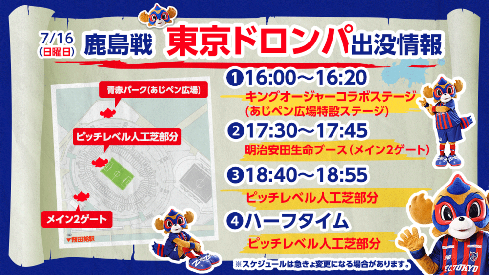 16 de julho (Dom) 2023 Meiji Yasuda Life Insurance Company J1 League Rodada 21 vs Kashima Antlers (Início às 19:00 / Ajinomoto Stadium) TOKYO DOROMPA aparecerá conforme abaixo.