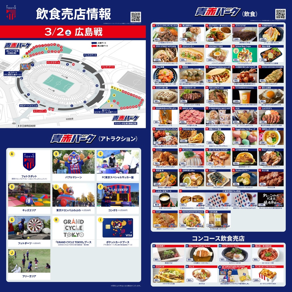 Informamos sobre as opções de alimentos e bebidas que serão vendidas no AO-AKA PARK (fora do estádio) e nas lojas dentro do concourse do estádio no dia 2 de março (Sáb), durante o jogo contra o Sanfrecce Hiroshima.