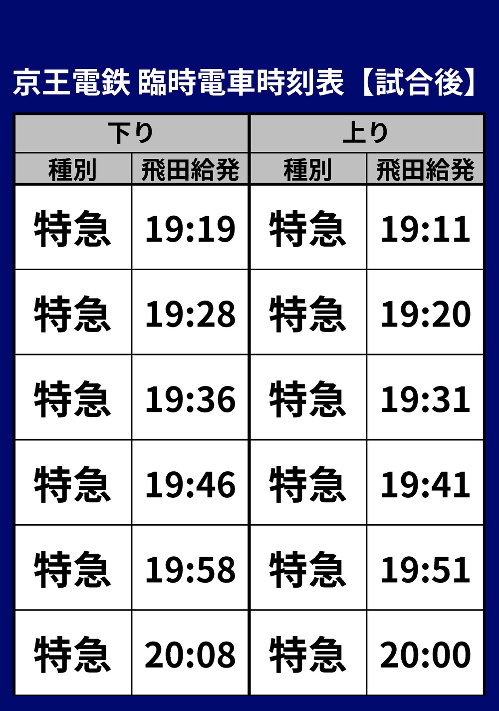 Sentido descente… 6 trens expressos partindo de Tobitakyu entre 19:19 e 20:08