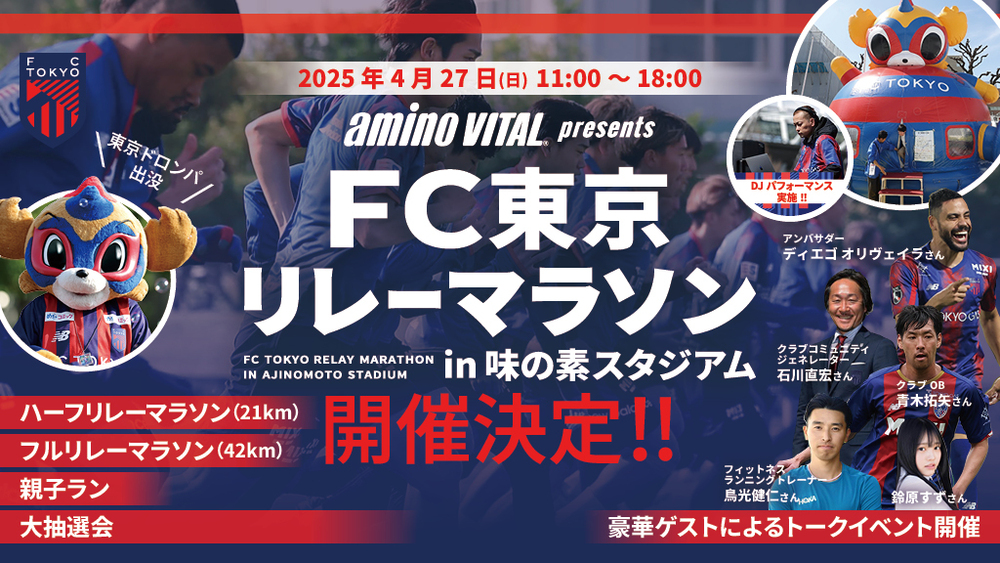 Foi confirmada a parceria principal com "Amino Vital® (AJINOMOTO CO., INC.)" e o nome do evento foi definido como "Amino Vital® presents FC Tokyo Relay Marathon no Ajinomoto Stadium". A participação do convidado CG Ishikawa foi confirmada.