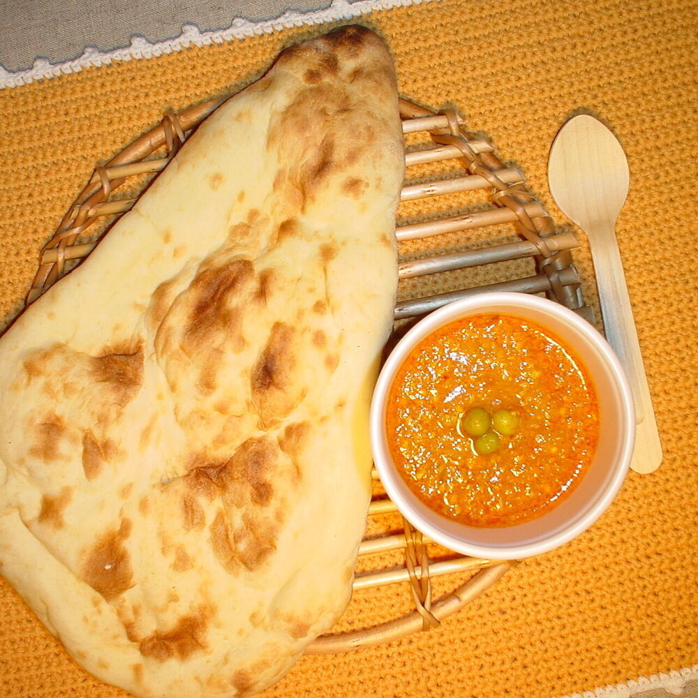 O naan assado no forno tandoor a carvão tem um sabor secreto levemente adocicado. Cada naan é assado na hora do pedido, quente e delicioso! O curry preparado por um chef indiano autêntico utiliza especiarias indianas, sendo um curry indiano único, autêntico e que agrada ao paladar japonês.