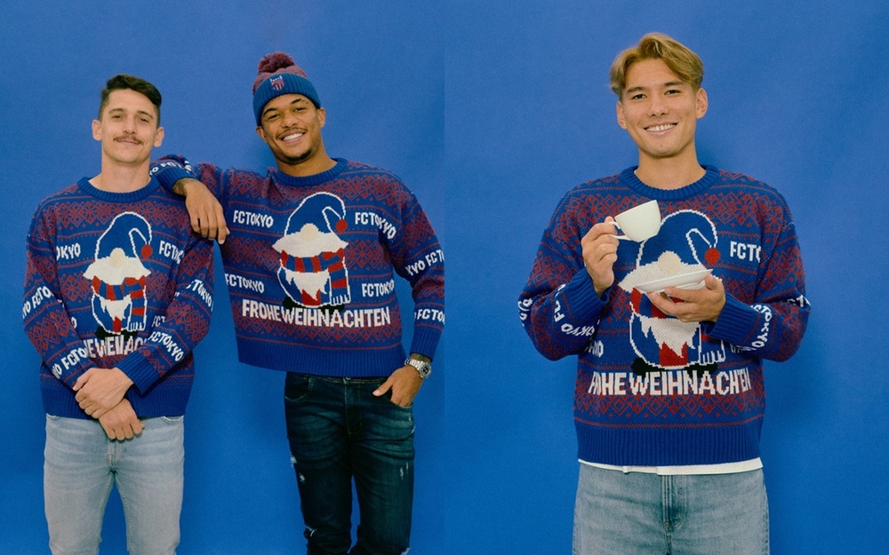 No centro, há um Papai Noel em azul e vermelho e, em alemão, a frase FROHE WEIHNACHTEN (Feliz Natal) em destaque. O suéter feio original do FC Tokyo pode ficar estiloso ou brega, dependendo de como você o usa!?