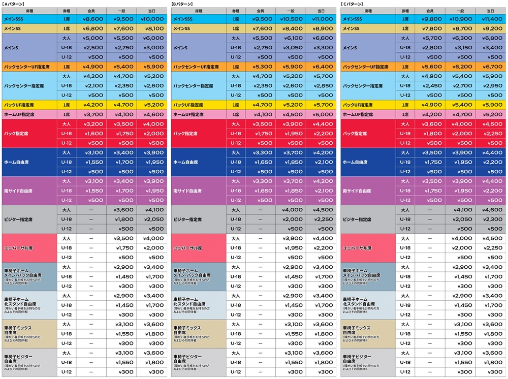 ※Os métodos de venda de ingressos e as faixas de preço podem ser alterados dependendo da época do jogo e do adversário.