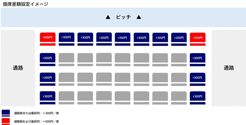 Na venda de ingressos unitários para cada partida, será aplicada uma diferença de preço opcional para os assentos reservados localizados na "beira do corredor" e na "primeira fila". Ao adquirir assentos na beira do corredor ou na primeira fila de cada bloco, será acrescido um preço opcional (+300 ienes por assento).