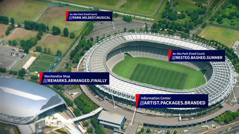 Cada quadrado de 3 metros recebeu uma combinação única de três palavras: um endereço what3words. Adicionamos aqui alguns locais populares para o Estádio Ajinomoto e o Estádio Nacional: