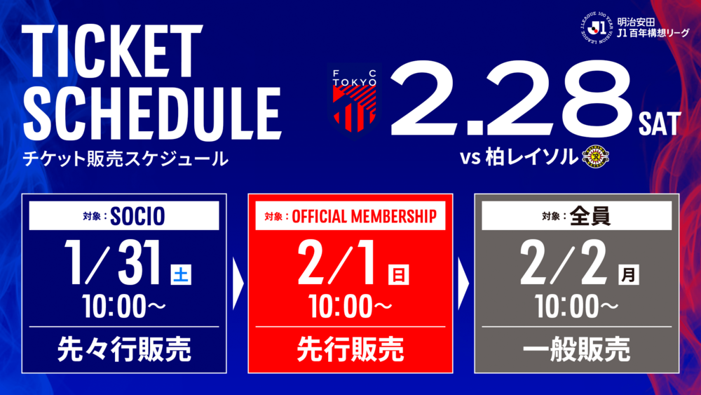 Informamos sobre a venda de ingressos para o jogo da 4ª rodada da Meiji Yasuda J1 Century Vision League contra Kashiwa Reysol em 28 de fevereiro (Sáb) (início às 15:00 / Ajinomoto Stadium).