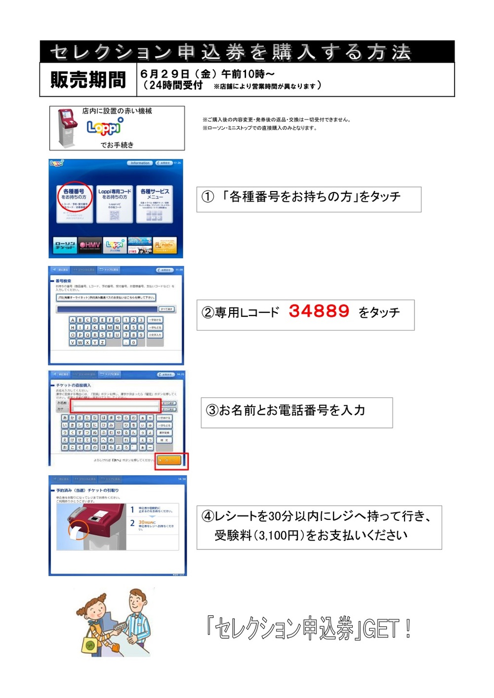 Compre o ≪bilhete de inscrição≫ para a seleção no Loppi, instalado nas lojas Lawson ou Ministop mais próximas.