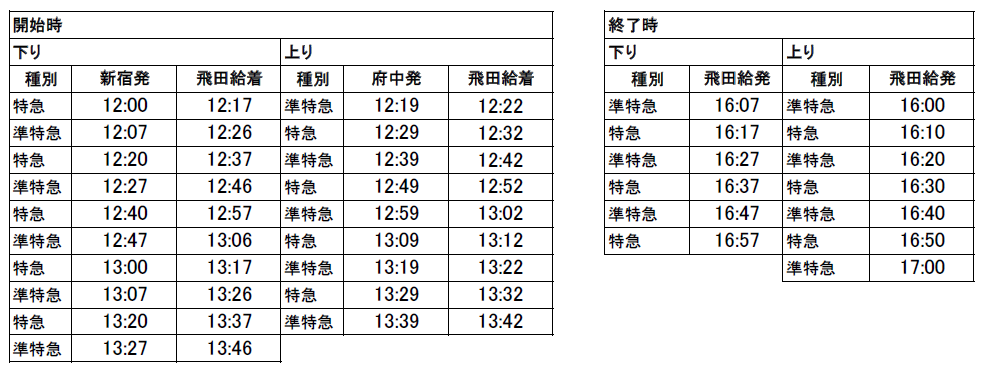 Sentido descida… 10 trens expressos e semi-expressos das 12:00 às 13:27 saindo de Shinjuku