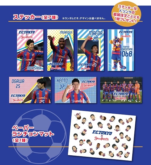 Além disso, ao pedir o "Menu Colaborativo Original F.C.TOKYO", ganhe 1 adesivo (7 tipos no total) e 1 jogo americano (1 tipo no total) de presente!