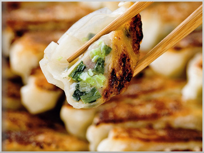 Gyoza jumbo suculento e bolinhos de alho-poró, feitos com ingredientes selecionados. Utilizamos carne de porco e repolho nacionais, alho da província de Aomori, alho-poró da província de Tochigi, gengibre da província de Kochi, entre outras carnes e vegetais frescos.