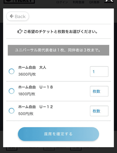 3. Selecione o número de ingressos desejados e pressione 【Confirmar assentos】