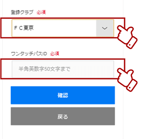 5. Selecione 『FC Tokyo』 em 【Clube Registrado】, insira o 『Número de Sócio』 do registrante em 【ID do Passe de Toque Único】 e pressione 【Confirmar】