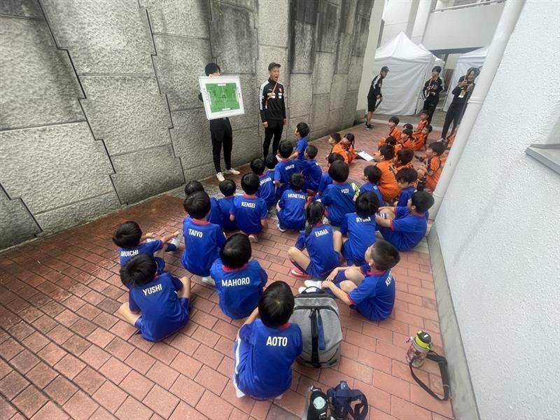 スタジアム到着後は、清水エスパルスのコーチの話を聞き、前座試合に向けた注意事項などを説明してくださいました。