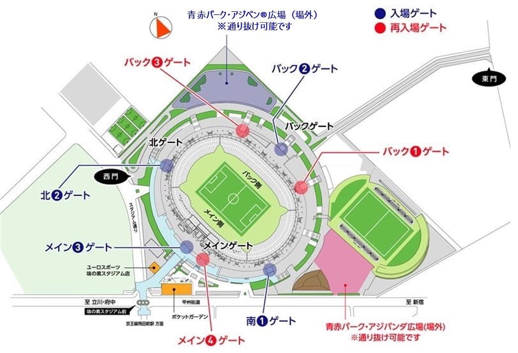 | 京王(メイン3)ゲート | メインSSS指定席、メインSS指定席、メインS指定席、バックセンターUF指定席、バックセンター指定席、バックUF指定席、ホームUF指定席、バック指定席、南サイド自由席、車椅子ホームメインバック自由席、車椅子北スタンド自由席、車椅子ミックス自由席、車椅子ビジター自由席、ユニバーサル自由席 |
