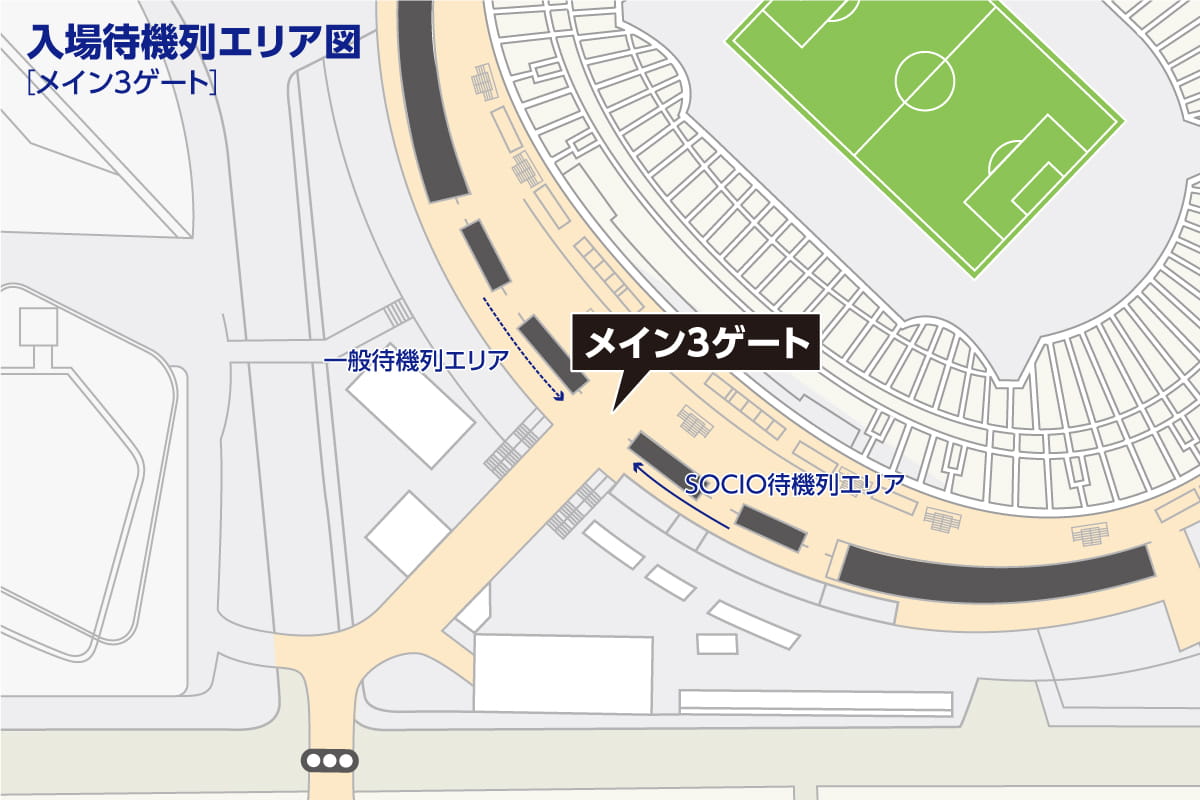 キックオフ4時間前よりメインゲート、バックゲート、南1ゲートの待機列エリアにお並びください。場所取り後は待機列を離れることが可能です。