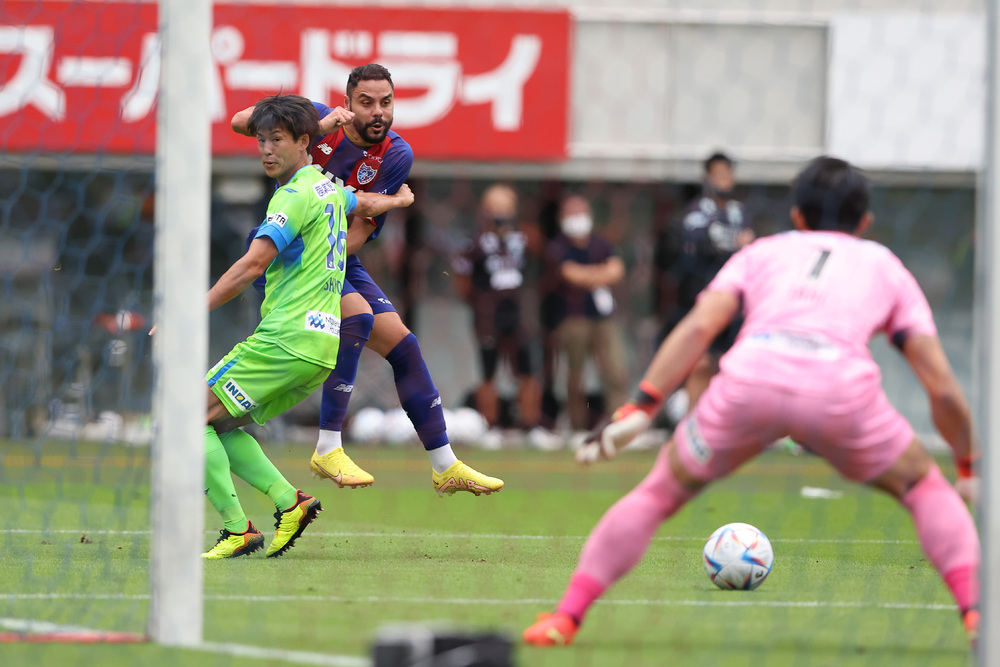 在难以创造机会的情况下,上半场23分钟,Kashif BANGNAGANDE球员带球深入对方左侧半场,传出回撤方向的传中球。飞奔到门前的Diego OLIVEIRA球员和塚川孝辉球员未能接应,球滚到了禁区外,但Leandro球员迅速插上,一触即发射出猛烈射门。虽然被对方后卫封堵,但终于撼动了对手,创造了机会。