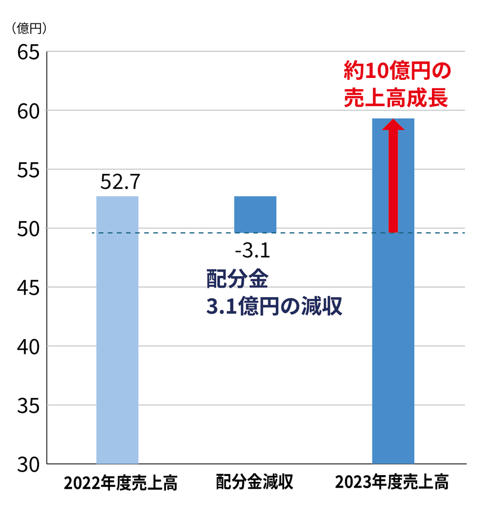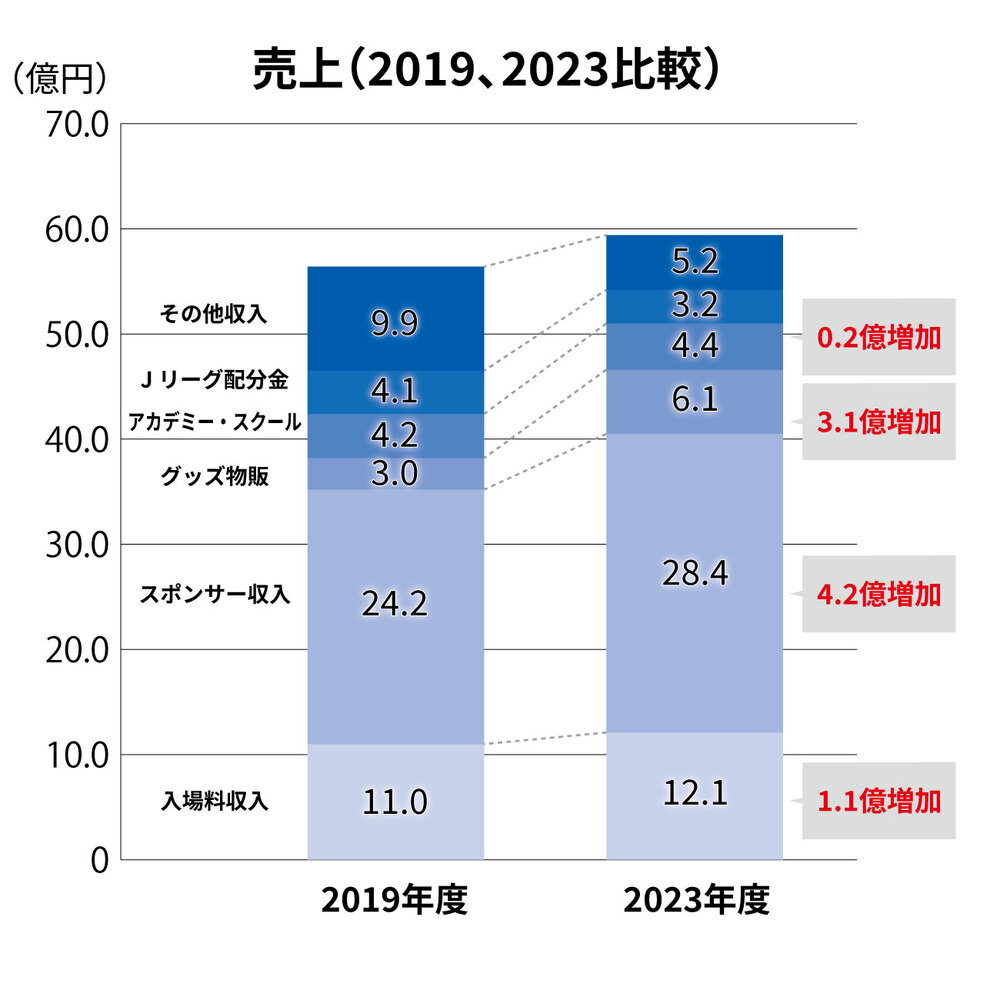 川岸 俱乐部经营规模的体现是销售额。相比疫情前的2019财年约为56.35亿日元,2023财年约为59.29亿日元。增加了约3亿日元。与上一财年相比增加了6.6亿日元。这是俱乐部历史上的最高数字,突破了以往的天花板。感谢球员、球队工作人员、俱乐部职员、球迷支持者以及合作企业的各位。