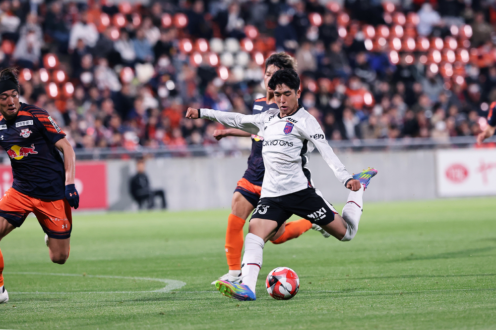 东京从比赛一开始就占据优势,获得了许多定位球机会。球队也能有效应对对手的反击,通过前场积极的逼抢夺回球权。上半场第22分钟,右侧展现了协同防守,在高位成功断球。随后北原选手在中路接球,用左脚精准射出一记强力远射,但球稍稍偏向球门右侧。背号53的他露出懊恼的表情仰望天空,坐在球门后方的蓝红色团队力量们为他送上了“马基”的呼声。