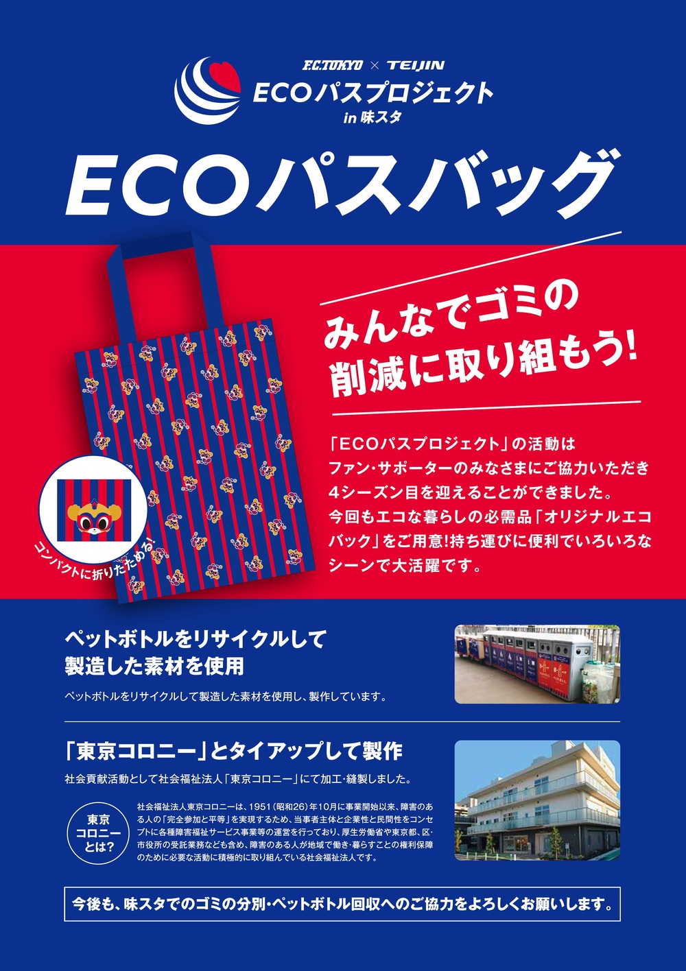 与TEIJIN FRONTIER Co., Ltd.共同实施的“味之素体育场ECO通行证项目”活动,在广大球迷和支持者的协助下迎来了第4个赛季。本赛季也将销售使用回收塑料瓶制造材料的ECO通行证包。