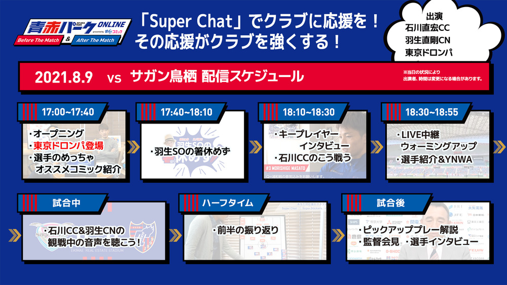 FC东京在J1联赛的客场比赛以及部分主场比赛的赛前赛后,通过YouTube【FC东京官方频道】举办LIVE直播企划『AO-AKA PARK在线赛前/赛后 presented by mechacomic』。