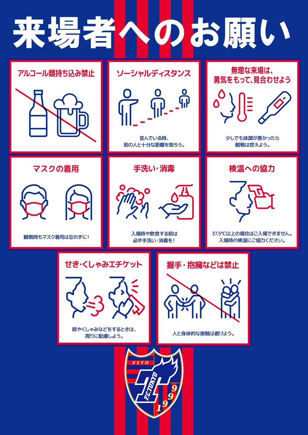 请遵守J联赛统一禁止规则(J联赛通用观赛礼仪与规则)、FC东京足球比赛运营管理规定,以及“J联赛新冠病毒感染症应对指南”。