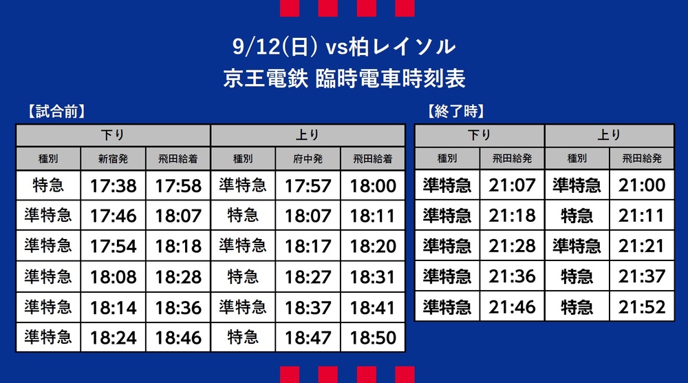 9月12日(周日) 2021明治安田生命J1联赛 第28轮 vs 柏太Reysol(19:00开球/味之素体育馆)的临时交通接驳(铁路)相关信息通知。