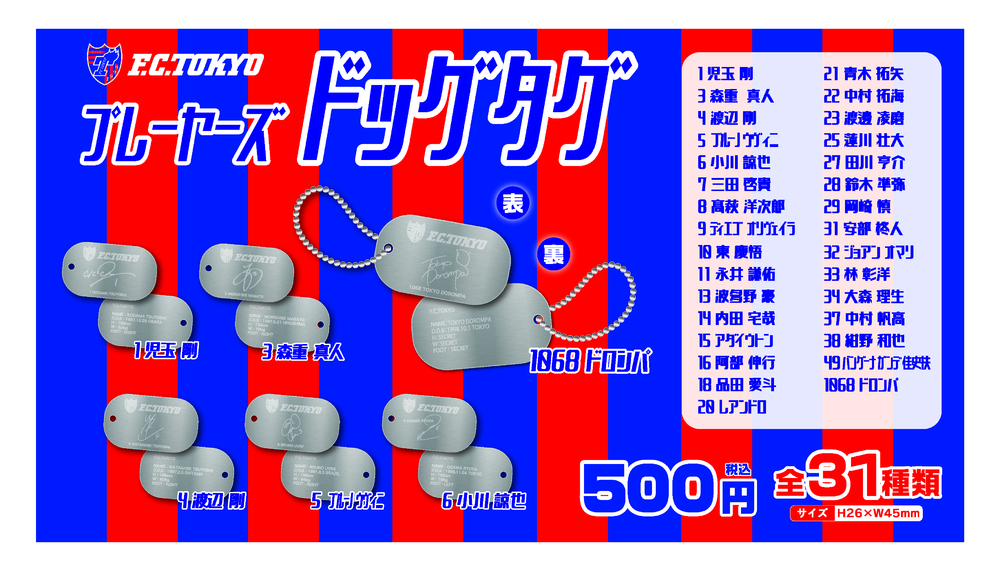 这是配饰中经典的项链!我们准备了印有简洁F.C.TOKYO标志版和TOKYO DOROMPA版的牌子!佩戴它,感受FC东京的魅力!