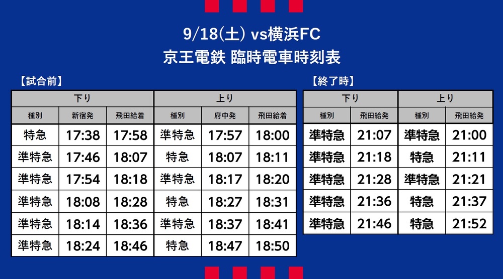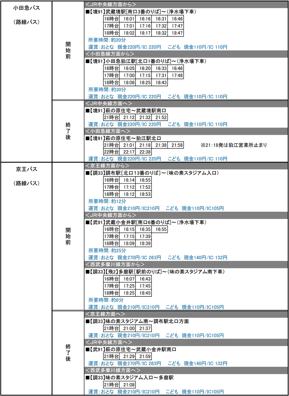 9月18日(周六) 2021明治安田生命J1联赛 第29轮 vs 横滨FC(19:00开球/味之素体育馆)将运营的临时交通接驳(铁路)、穿梭巴士・线路巴士相关信息。