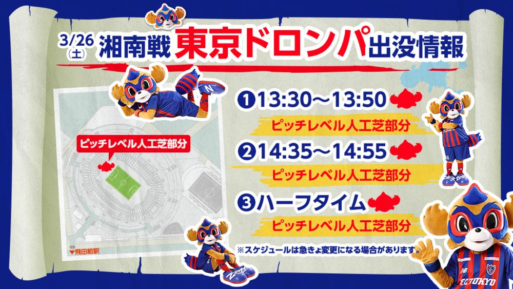 3月26日(周六) 2022J联赛YBC鲁万杯 第3轮 vs Júbilo磐田(15:00开球/味之素体育馆)中TOKYO DOROMPA将如以下所示出现。
