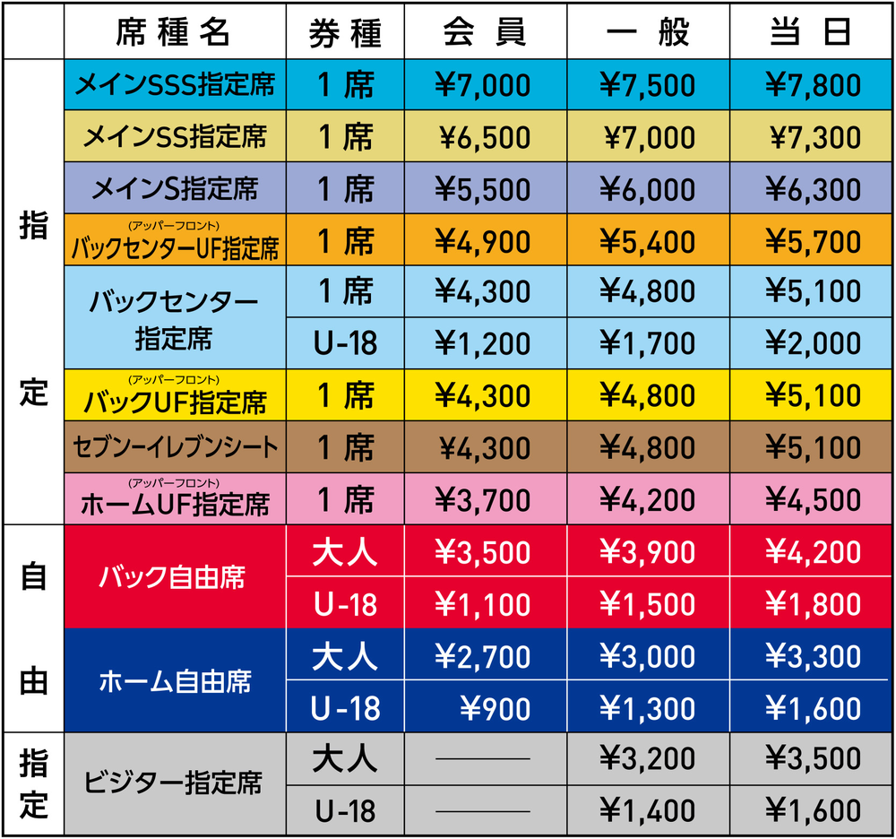 ※访客队的球衣和商品的穿着,以及支持访客队的座位种类为上述的“主看台SS指定席 南侧”、“主看台S指定席 南侧”、“访客指定席”这三种座位,其他所有座位均为FC东京的支持席。