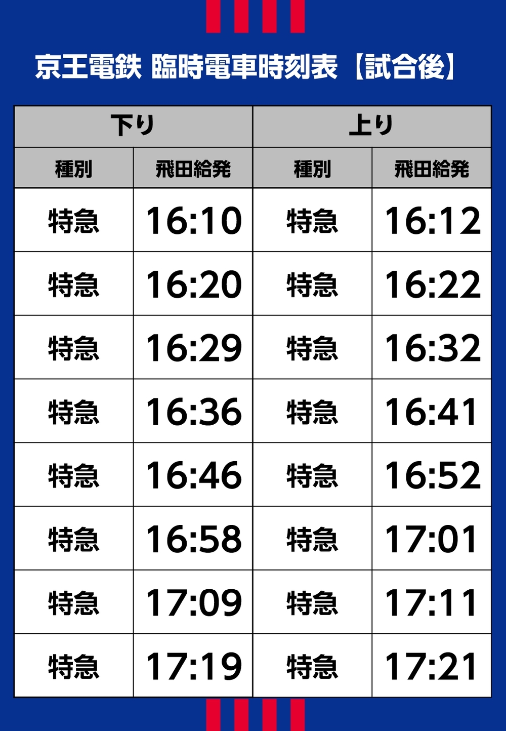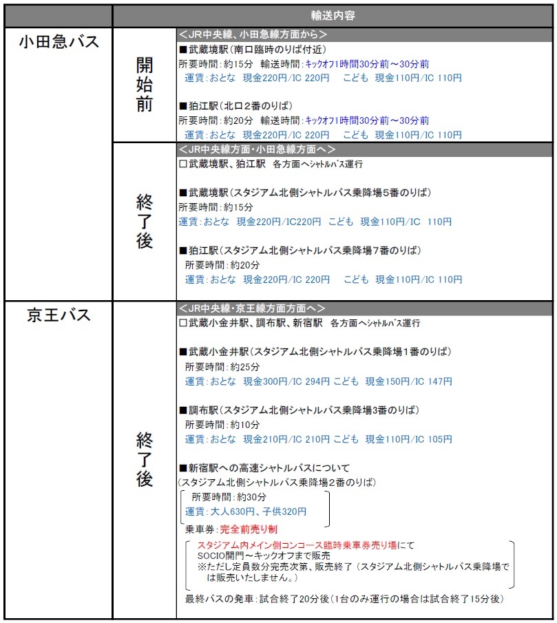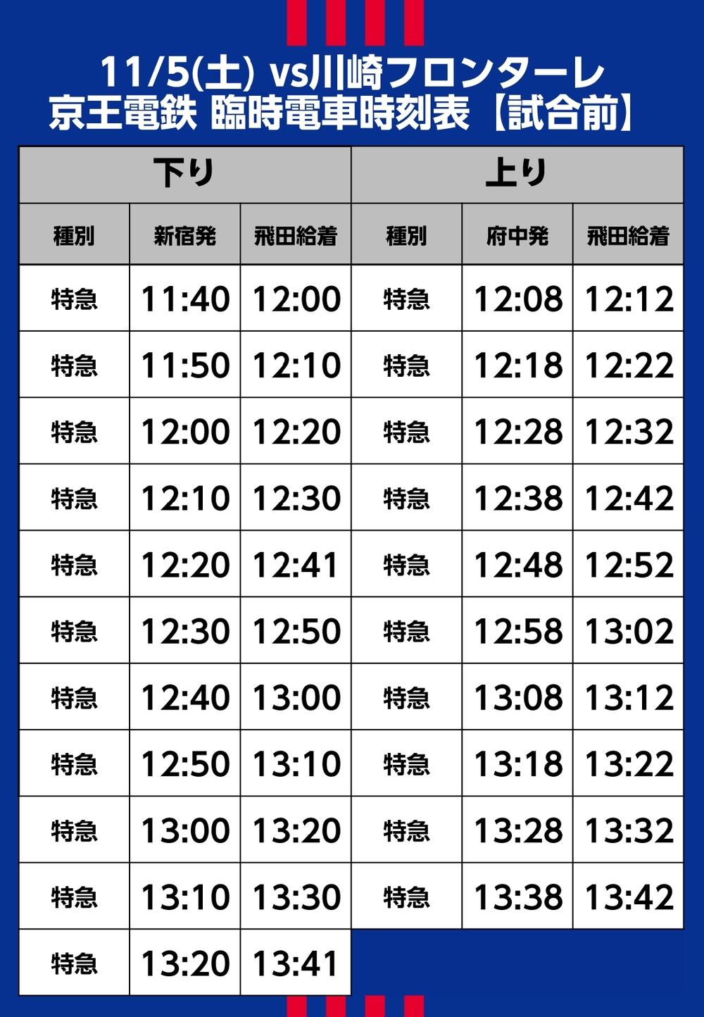 11月5日(周六) 2022明治安田生命J1联赛 第34轮 vs 川崎Frontale(14:00开球/味之素体育馆)将提供的临时交通接驳(铁路)、穿梭巴士及线路巴士的相关信息。