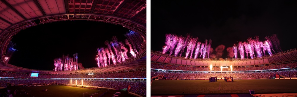 从味之素体育馆屋顶发射特殊效果烟花,灯光演出