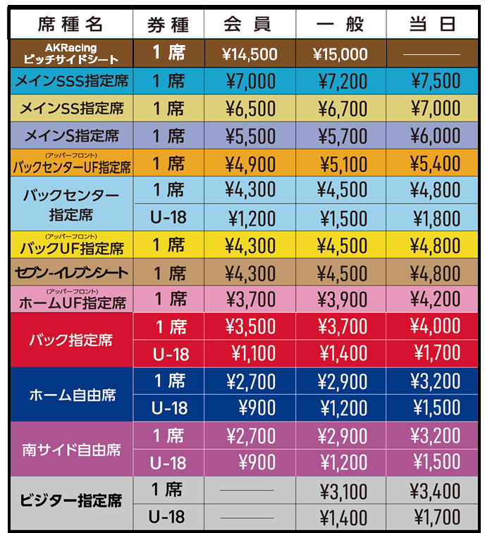 ※可以穿着访客队的球衣、周边商品及为访客队加油的座席种类为上述的“主看台SS指定席 南侧”、“主看台S指定席 南侧”、“访客指定席”这三种座席,其他所有座席均为FC东京的加油席。