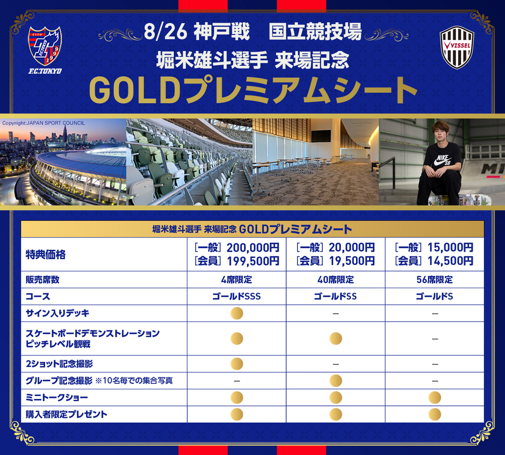 8月26日(周六) 2023明治安田生命J1联赛 第25轮 vs Vissel神户(19:00开球/日本国立体育场)当天,滑板男子街式选手堀米雄斗作为比赛当天特别嘉宾到场,特此发售『GOLD高级座席』。