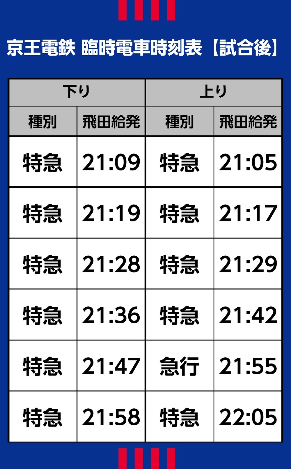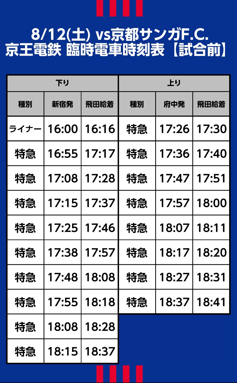 8月12日(周六) 2023明治安田生命J1联赛 第23轮 vs 京都Sanga F.C.(19:00开球/味之素体育馆)期间运营的临时交通接驳(铁路)、穿梭巴士及线路巴士的相关信息。