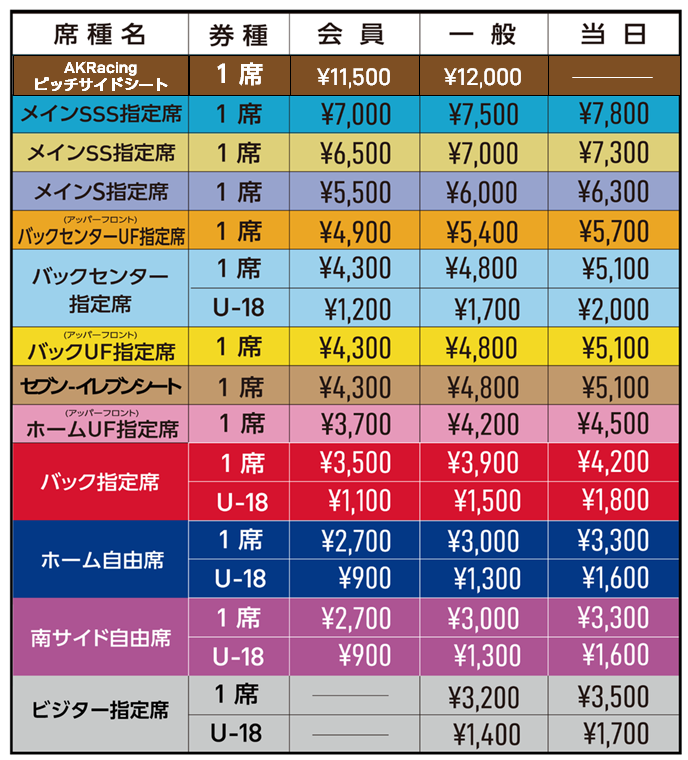 ※可以穿着访客队的球衣、周边商品及为访客队加油的座席种类为上述的“主看台SS指定席 南侧”、“主看台S指定席 南侧”、“访客指定席”这三种座席,其他所有座席均为FC东京的加油席。