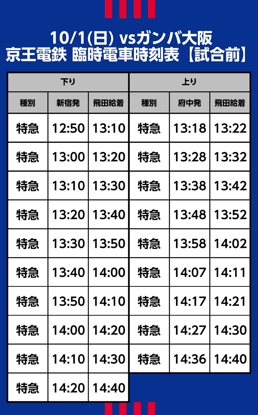 2023年10月1日(周日) 明治安田生命J1联赛 第29轮 vs Gamba大阪(15:00开球/味之素体育馆)期间运营的临时交通接驳(铁路)、穿梭巴士及线路巴士的相关信息。