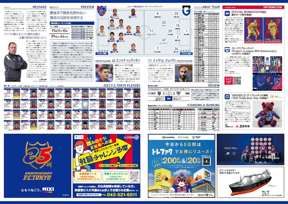 2023年10月1日(周日) 明治安田生命J1联赛 第29轮 vs Gamba大阪(15:00开球/味之素体育馆)的官方比赛日程安排如下。