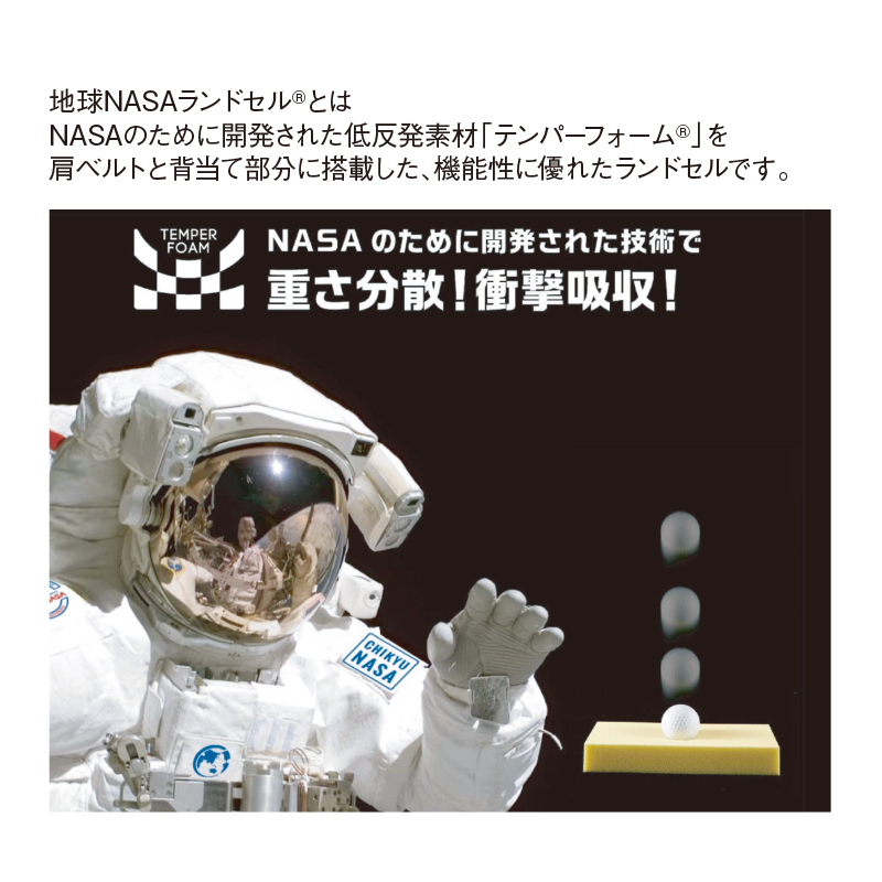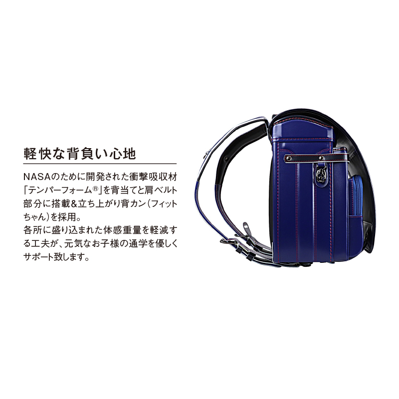 肩带和背部衬垫部分搭载的“Temper Foam®”是为NASA开发的冲击吸收材料。曾用于航天飞机的座椅。通过在肩带和背部衬垫采用这种高密度低反弹材料,书包能够贴合孩子的身体。触感舒适,具有优异的吸湿性和速干性,背负时更加舒适。