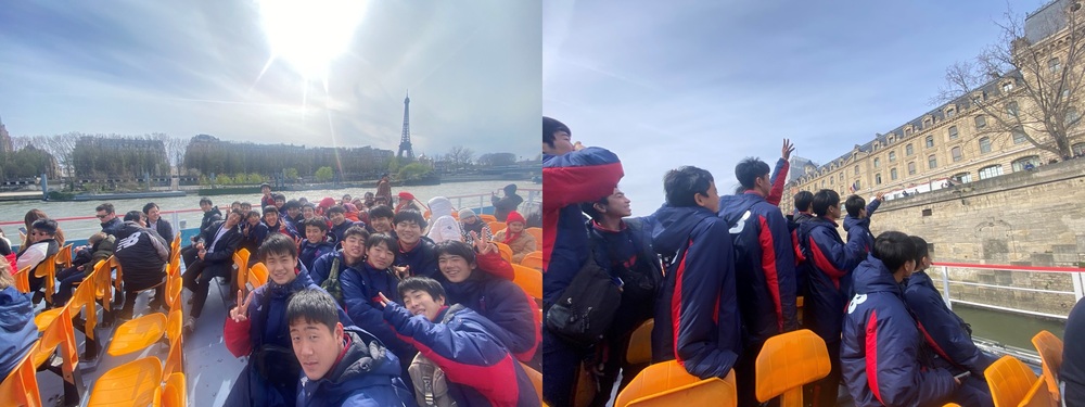 在塞纳河游船上,我们巡游了2024年巴黎奥运会开幕式运动员入场时使用的水上路线。当埃菲尔铁塔与巴黎的象征并肩出现时,运动员们兴奋不已。大家一起拍了纪念照。此外,他们还一边欣赏与日本不同的街景,一边全程享受这次旅程。